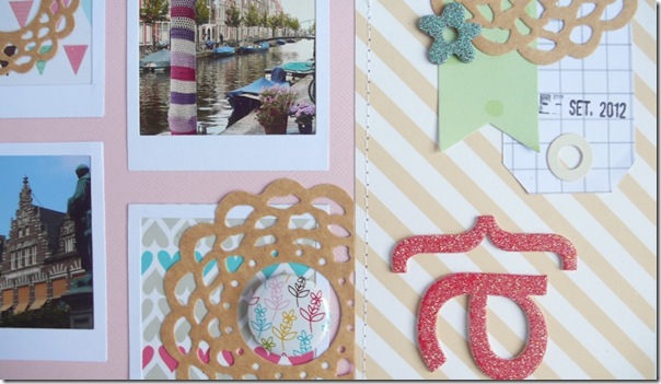 6- Adhere a second piece of doily into a polaroid with patterned paper, near the yellow stripe.