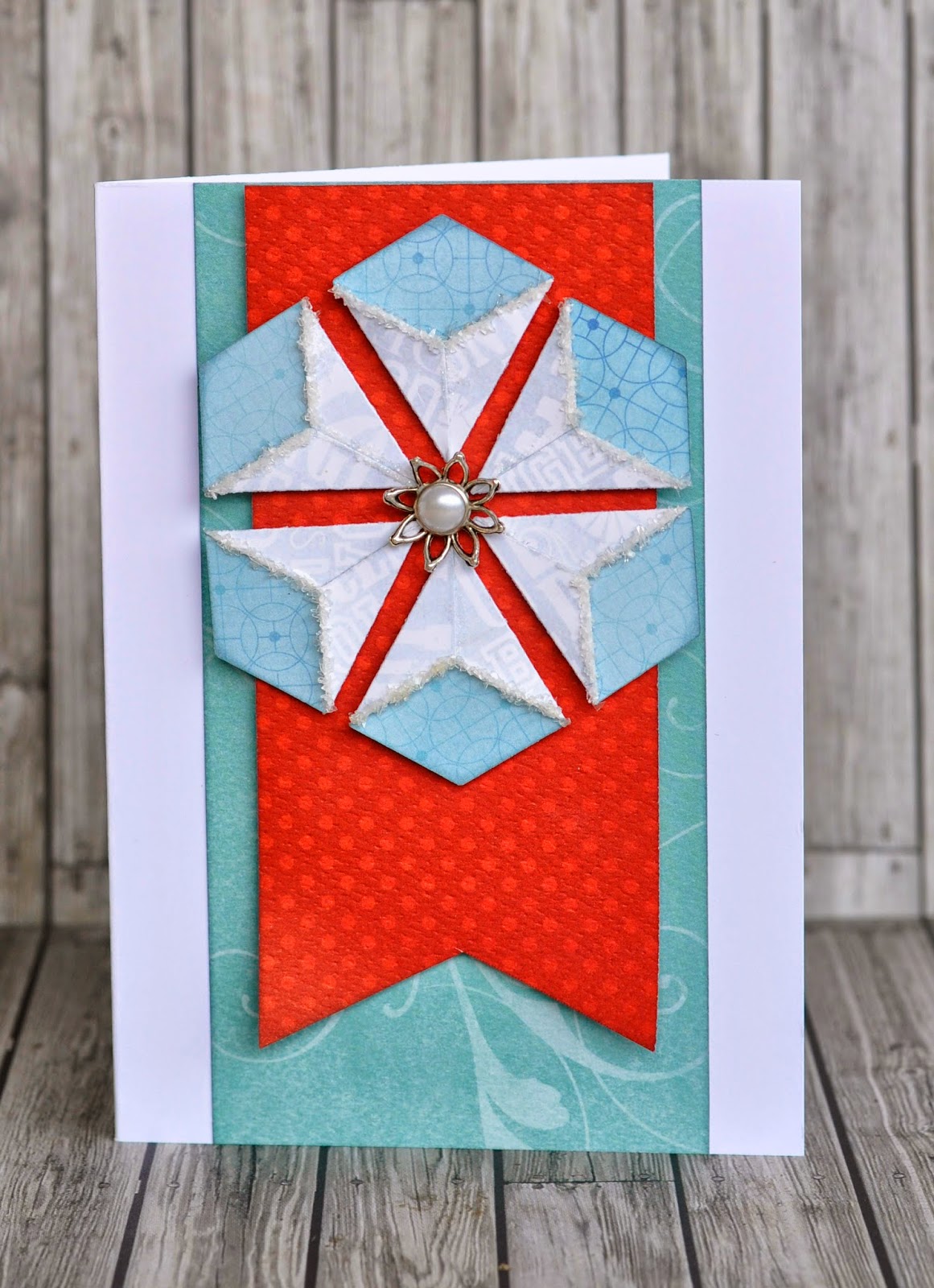 I couldn't stop at one card so I thought I'd try a different colours, I know it's a bit early for Christmas cards but it made such a wicked snowflake. This time I folded the flaps closed and strategically applied some Pinflair Ice Diamond together with a pearl charm in the centre.
