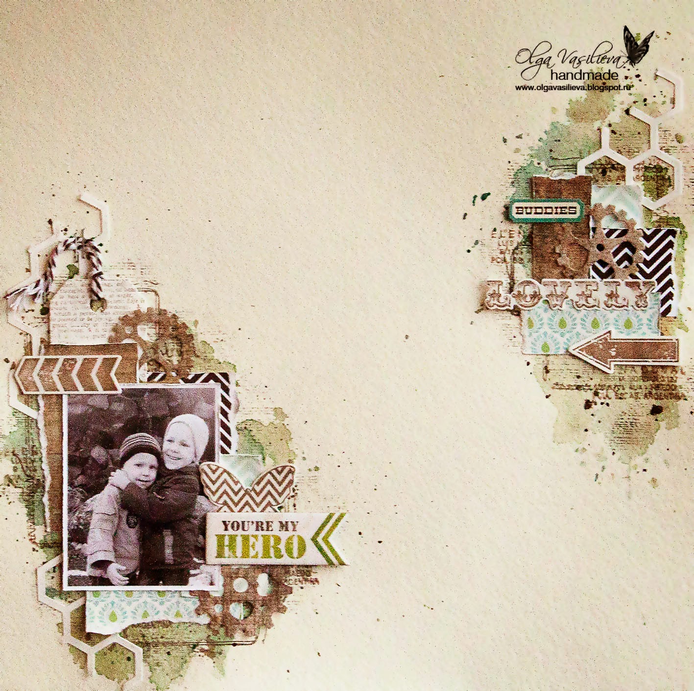 Here is my new layout for you. It's very nasty outside but sincere hugs can make any project very warm)) I used one of my favourite set of colours: brown, tortoise and green. I think it perfectly match for boyish projects.