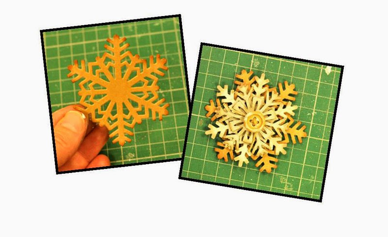 I next die-cut a large snowflake from the same Thinlits set and inked the edges using Walnut Stain Distress Ink. This is a very strong colour so gently does it! At the same time I inked the tips of the other snowflakes and the edges of the square. I used adhesive foam pads to layer the snowflakes and attached a threaded wooden button to the centre which I lightly distressed by adding a little gesso with my fingertips.