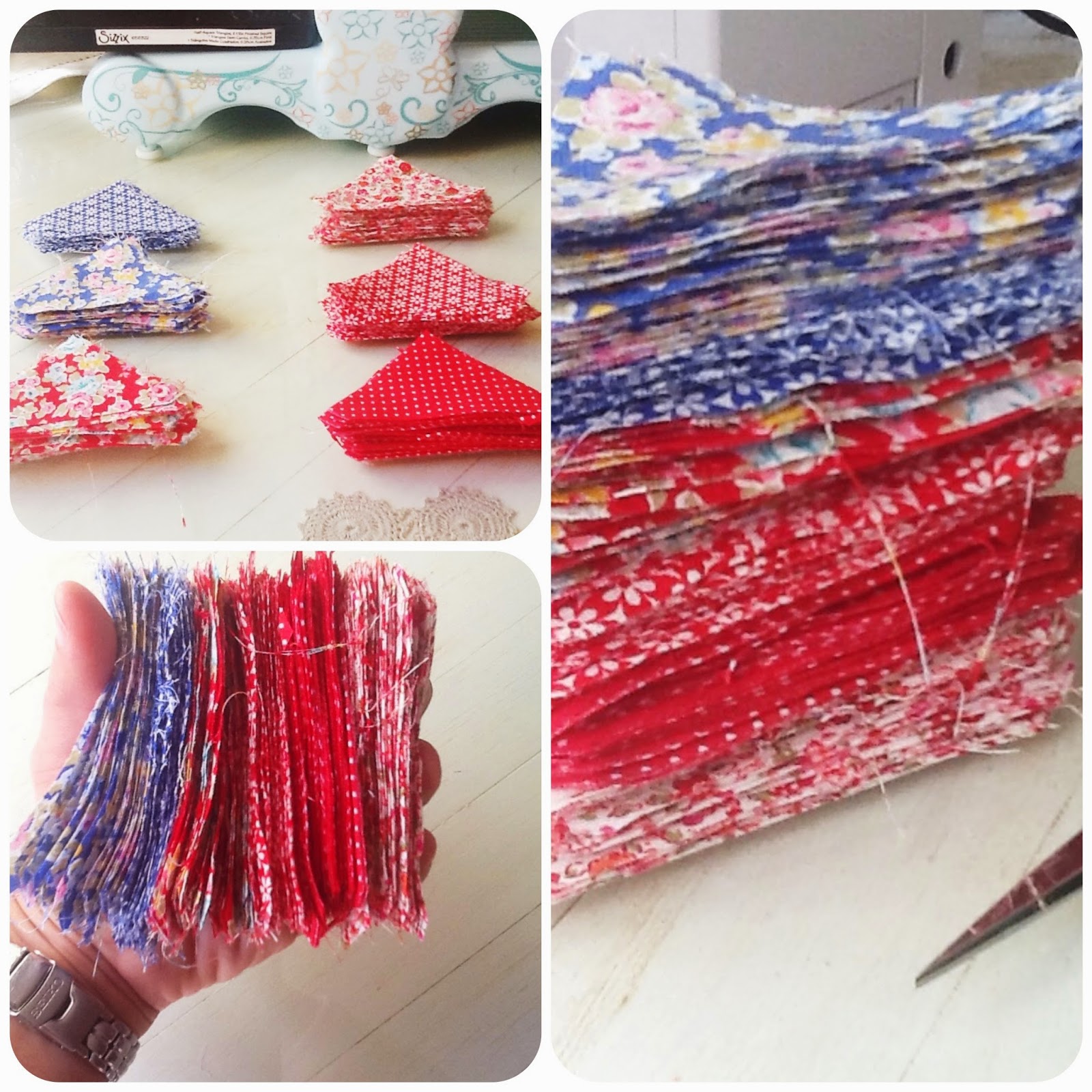 Necesité seis telas diferentes para cortar los triángulos. Primero formé 16